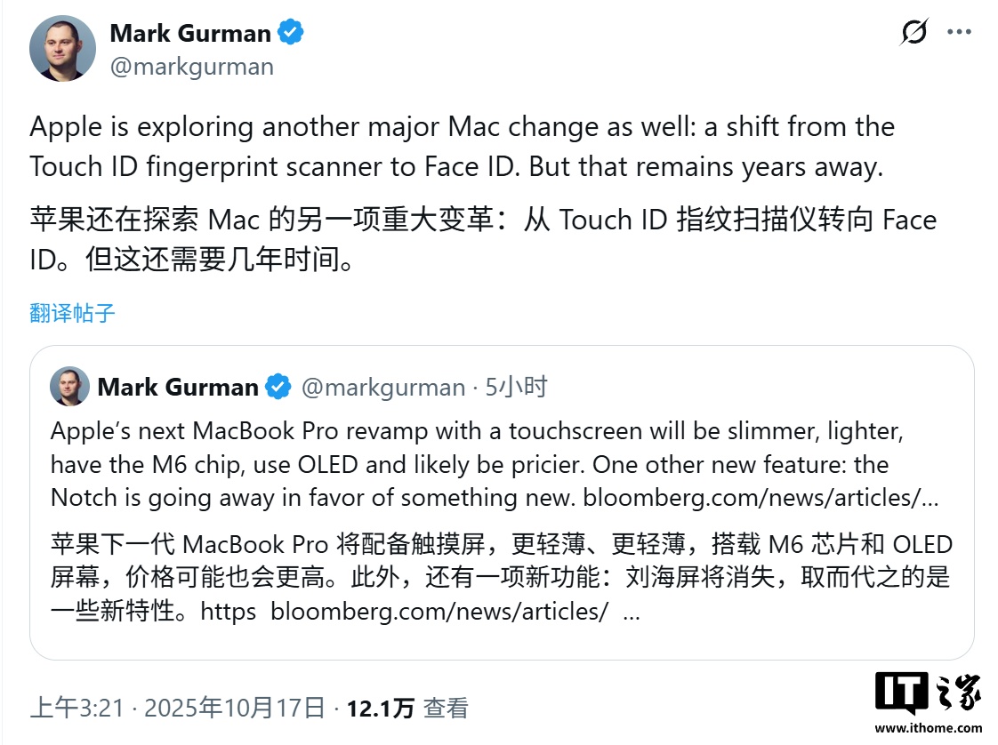科技媒体 MacRumors 在博文中指出,这已不是古尔曼第一次做出类似预测。在过去五年中,他曾多次预测 Mac 将搭载面容 ID,但预测屡次落空。