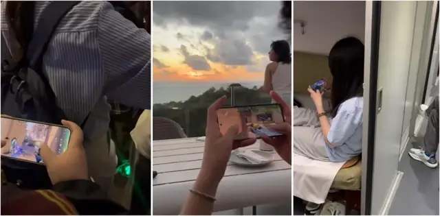 但接下来几天我发现事情不简单,饭点爆满的餐厅中、小憩观景的咖啡店内、前往各大省市的火车上、景区运营的观光车/索道里、等待女友换装的妆造店前……但凡能稍微停下来休息会儿的地方,都能发现“打瓦手”的身影。